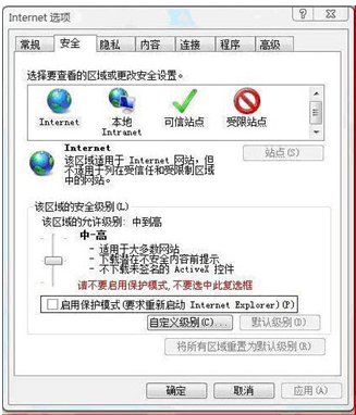 ?、热绻荲ista或win7(某些版本有保護模式)操作系統(tǒng)用戶,請按照下圖將IE受保護模式取消。