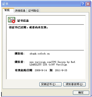 ?、谠贗E選項——內容——證書——查詢中,看到如下消息,提示證書已經過期或者尚未生效。